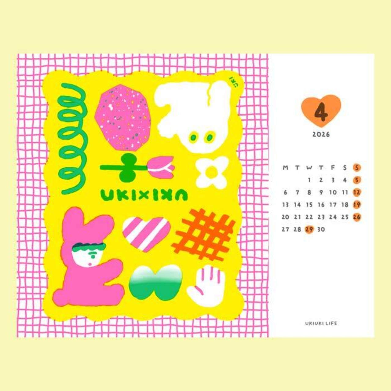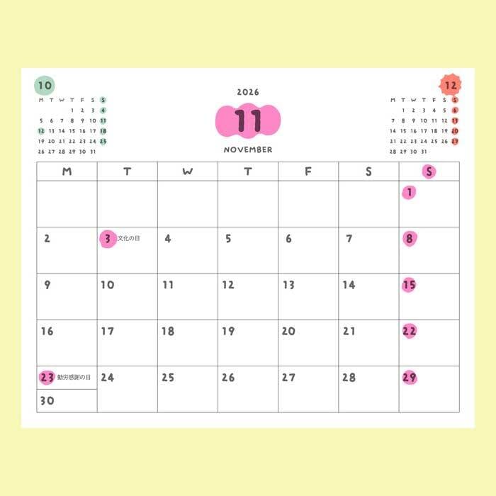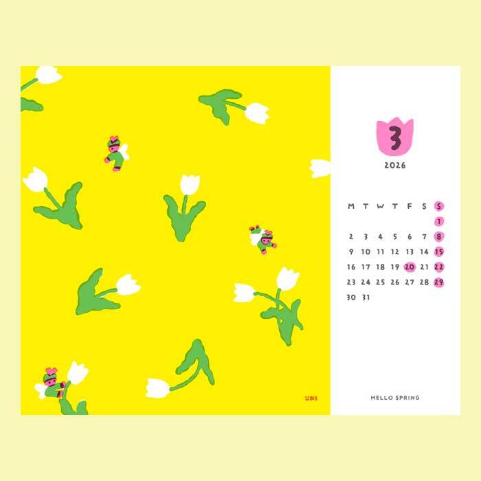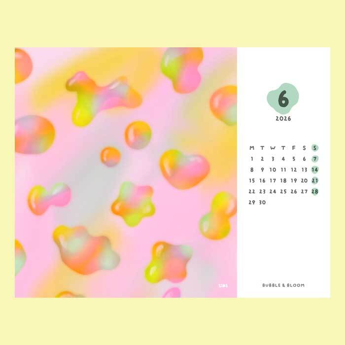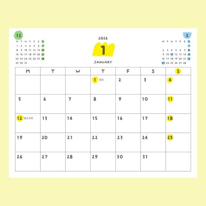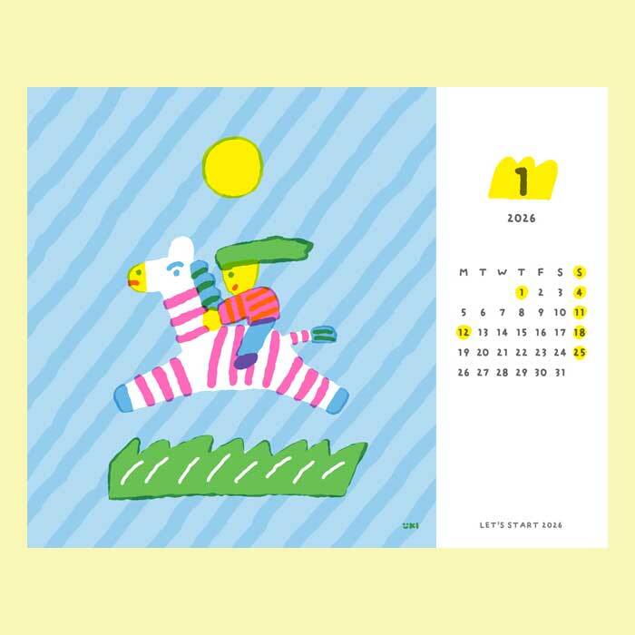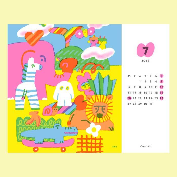 こちらはイラストレーター・いとい ゆきさんデザインの「机の上から広がるカラフルな毎日」をテーマに、12ヶ月のイラストとパターンをセレクトした、2026年版カラフルカレンダーです。