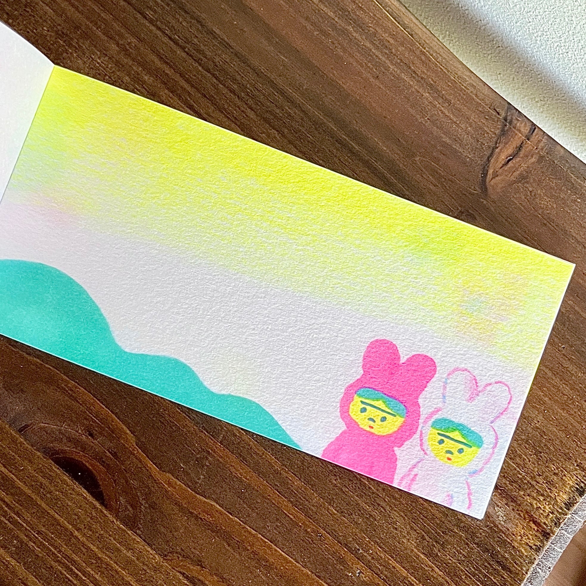 いといゆきさんのカラフルでかわいいキャラクターたちがあしらわれたデザインの一筆箋「USAGI」です。タイトルどおりうさぎの姿をしたかわいい子たちがふわふわと鮮やかに描かれています。この一筆箋では今回、蛍光色のような明るい印刷の発色が楽しめるが、使用されている美濃和紙と相性がよくとても魅力的です。